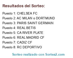 Lista de participantes: RC DEPORTIVO, CHELSEA FC, CADIZ CF, REAL BETIS, REAL MADRID CF, PARIS SAINT GERMAIN, CA RIVER PLATE, AC MILAN o DORTMUND.