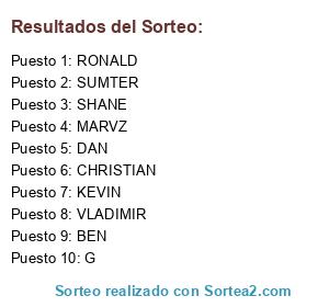 Lista de participantes: DAN, BEN, RONALD, G, SUMTER, CHRISTIAN, SHANE, KEVIN, MARVZ, VLADIMIR.