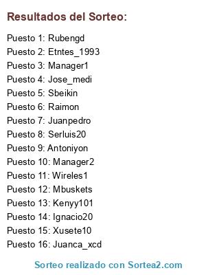 Lista de participantes: Serluis20, Rubengd, Raimon, Jose_medi, Antoniyon, Juanca_xcd, Juanpedro, Xusete10, Ignacio20, Sbeikin, Mbuskets, Etntes_1993, Wireles1, Kenyy101, Manager1, Manager2.