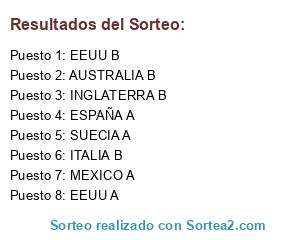 Lista de participantes: EEUU A, ESPAÑA A, SUECIA A, MEXICO A, EEUU B, INGLATERRA B, ITALIA B, AUSTRALIA B.