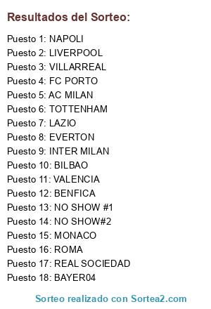 Lista de participantes: FC PORTO, INTER MILAN, TOTTENHAM, BAYER04, AC MILAN, EVERTON, VALENCIA, MONACO, ROMA, REAL SOCIEDAD, NO SHOW #1, LAZIO, NAPOLI, LIVERPOOL, VILLARREAL, BENFICA, NO SHOW#2, BILBAO.