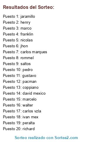Lista de participantes: coppiano, jaramillo, carlos vzla, carlos marques, franklin, gustavo, henry, jhon, peralta, marcelo, marco, nicolas, pacman, pedro, richard, rommel, saltos, walter, david mexico, ivan mex.