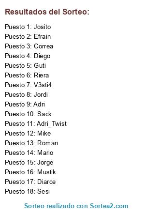 Lista de participantes: Adri, Roman, Guti, Jordi, Mario, Sack, Jorge, Mustik, Riera, Diego, V3sti4, Adri_Twist, Correa, Diarce, Efrain, Sesi, Mike, Josito.