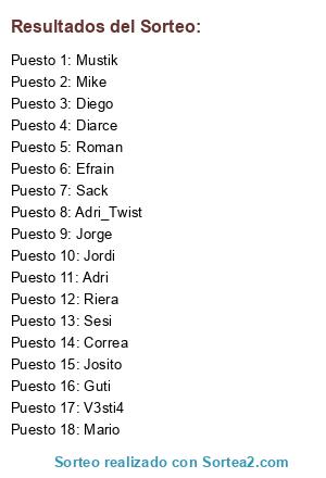 Lista de participantes: Adri, Roman, Guti, Jordi, Mario, Sack, Jorge, Mustik, Riera, Diego, V3sti4, Adri_Twist, Correa, Diarce, Efrain, Sesi, Mike, Josito.