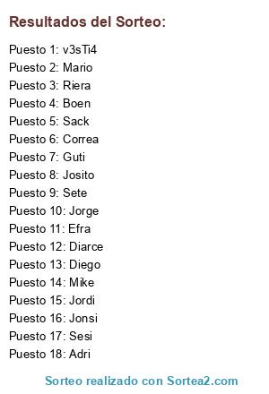 Lista de participantes: Guti, Jorge, Efra, Jonsi, Josito, Sete, Sack, Diego, Diarce, Correa, Boen, Mario, Adri, Riera, Mike, v3sTi4, Jordi, Sesi.