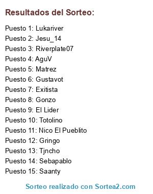 Lista de participantes: AguV, Gonzo, Gringo, El Lider, Exitista, Gustavot, Jesu_14, Lukariver, Matrez, Nico El Pueblito, Riverplate07, Saanty, Sebapablo, Tjncho, Totolino.