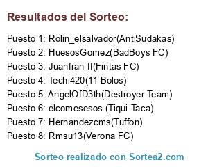 Lista de participantes: elcomesesos (Tiqui-Taca), Rolin_elsalvador(AntiSudakas), Techi420(11 Bolos), Hernandezcms(Tuffon), Rmsu13(Verona FC), Juanfran-ff(Fintas FC), HuesosGomez(BadBoys FC), AngelOfD3th(Destroyer Team).