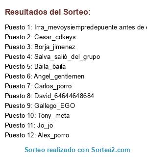 Lista de participantes: Salva_salió_del_grupo, Gallego_EGO, Cesar_cdkeys, Borja_jimenez, Tony_meta, Alex_porro, Carlos_porro, Baila_baila, David_64644648684, Angel_gentlemen, Irra_mevoysiempredepuente antes de empezar, Jo_jo.