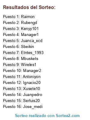 Lista de participantes: Serluis20, Rubengd, Raimon, Jose_medi, Antoniyon, Juanca_xcd, Juanpedro, Xusete10, Ignacio20, Sbeikin, Mbuskets, Etntes_1993, Wireles1, Kenyy101, Manager1, Manager2.