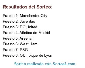 Lista de participantes: Juventus, Olympique de Lyon, DC United, Manchester City, Atletico de Madrid, PSG, Arsenal, West Ham.