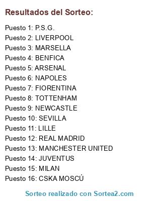 Lista de participantes: ARSENAL, JUVENTUS, MANCHESTER UNITED, NAPOLES, REAL MADRID, SEVILLA, BENFICA, CSKA MOSCÚ, LIVERPOOL, MILAN, P.S.G., NEWCASTLE, MARSELLA, LILLE, FIORENTINA, TOTTENHAM.