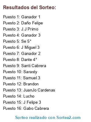 Lista de participantes: Lucho, Daño Felipe, JuanJo Cardenas, J.J Primo, Se 5°, Dante 4°, Samuel 3, J Miguel 3, Sarasty, Brandon, J Felipe 3, Santi Cabrera, Gabo Cabrera, Ganador 1, Ganador 2, Ganador 3.
