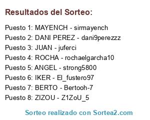 Lista de participantes: MAYENCH - sirmayench, ROCHA - rochaelgarcha10, ANGEL - strong5800, IKER - El_fustero97, DANI PEREZ - dani9perezzz, BERTO - Bertooh-7, ZIZOU - Z1ZoU_5, JUAN - juferci.
