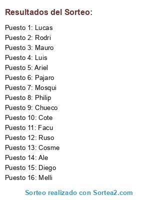 Lista de participantes: Lucas, Ruso, Mosqui, Mauro, Cosme, Luis, Pajaro, Philip, Diego, Ariel, Rodri, Melli, Cote, Facu, Chueco, Ale.