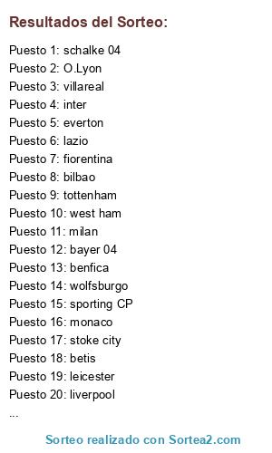 Lista de participantes: everton, liverpool, valencia, sevilla, villareal, milan, inter, betis, monaco, las palmas, bilbao, O.Lyon, leicester, stoke city, tottenham, west ham, napoles, roma, oporto, benfica, sporting CP, wolfsburgo, schalke 04, bor. mGladbach, bayer 04, lazio, celta, fiorentina.
