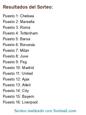 Lista de participantes: United, Psg, City, Juve, Tottenham, Marsella, Liverpool, Milan, Chelsea, Barsa, Borussia, Roma, Bayern, Madrid, Ajax, Atleti.
