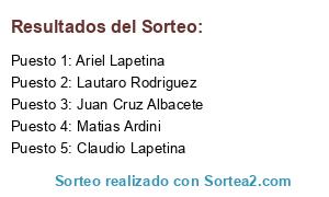 Lista de participantes: Ariel Lapetina, Claudio Lapetina, Orlando Coronel, Tomas coronel, Francisco Albacete, Juan Cruz Albacete, Lautaro Rodriguez, Oscar Rodriguez, Matias Ardini, Javier Lopez.