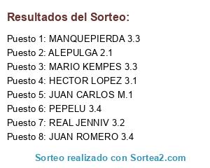 Lista de participantes: JUAN CARLOS M.1, MANQUEPIERDA 3.3, MARIO KEMPES 3.3, JUAN ROMERO 3.4, HECTOR LOPEZ 3.1, REAL JENNIV 3.2, PEPELU 3.4, ALEPULGA 2.1.