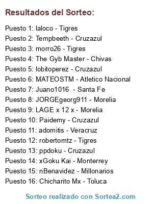 Lista de participantes: Chicharito Mx - Toluca, LAGE x 12 x - Morelia, Juano1016 - Santa Fe, lobitoperez - Cruzazul, laloco - Tigres, Paidemy - Cruzazul, Tempbeeth - Cruzazul, morro26 - Tigres, nBenavidez - Millonarios, The Gyb Master - Chivas, xGoku Kai - Monterrey, adomitis - Veracruz, JORGEgeorg911 - Morelia, MATEOSTM - Atletico Nacional, robertomtz - Tigres, ppdoku - Cruzazul.