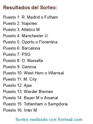 Lista de participantes: Tottenham o Sampdoria, Atletico M, West Ham o Villarreal, Napoles, PSG, Manchester U., R. Madrid o Fulham, O. Marsella, Genova, Barcelona, Bayer M o Arsenal, Inter M, Ajax, M. City, Werder Bremen, Oporto o Fiorentina.