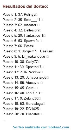 Lista de participantes: MARIO, PACO o ECUA, ADUMAT, CHUSTAMANTE, BARICELLI, PESDIOS o FISTA, FUENTESIKO oALEPGL, EXON TOGA, PENHA, CEBALLOS, RAMOS o KINGZELL, INTOCABLE, GARRY,o RAFUKA, CORTEX, JAS o PREDATOR, SIRKAISSER, CURROPORSCHE,, SITO, SPAWNTFE, MIGUECHE, SAMPERBE, ESMART, JOSELIYO, SORVOLO, KAMIKAZE, LUISMINHO, LEGO, FABIANO, DANITORIX, HERREROS o LUISIXU, MOI, FRESCO o NEGRI, PEPERECRE, ADRIORTIZ, ADRINIEBLA, AKTGANO,, ALENZEMA, BAENA, BLACKWOLF, CORDUBITA, DANIORLO, FALIN, FARBAX o XIPI, FENOY, FRANSIGALDA, FUENYOL, JUANANGEL, JUANMICORDOBA, KEFERGAS, LINCEDEO, LORDPEREZ, LUISO, MANUWATAGATA, MASKY, MIGUEE, PAU, o PESCA,, RUPI, CIENPORCIENGOFIO, SHERIFFCHENKO, SOTO, TONI89, TONI3_13, TROYANO, WAKANDU.