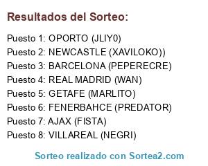 Lista de participantes: NEWCASTLE (XAVILOKO)), FENERBAHCE (PREDATOR), VILLAREAL (NEGRI), AJAX (FISTA), REAL MADRID (WAN), BARCELONA (PEPERECRE), OPORTO (JLIY0), GETAFE (MARLITO).