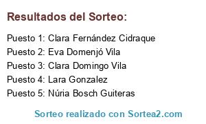 Lista de participantes: Anna Borrell Terribas, Carla Conejo González, Clara Domingo Vila, Clara Fernández Cidraque, Eva Domenjó Vila, Jaime Cano Martínez-Botas, Laia Castell Almuni, Lara Gonzalez, Mar Costa Valldemossa, Melania Ferrando, Núria Bosch Guiteras, Teresa Calafat.