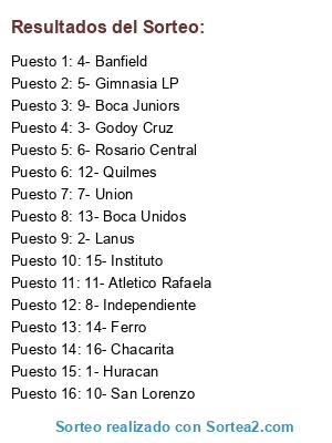 Lista de participantes: 1- Huracan, 2- Lanus, 3- Godoy Cruz, 4- Banfield, 5- Gimnasia LP, 6- Rosario Central, 7- Union, 8- Independiente, 9- Boca Juniors, 10- San Lorenzo, 11- Atletico Rafaela, 12- Quilmes, 13- Boca Unidos, 14- Ferro, 15- Instituto, 16- Chacarita.