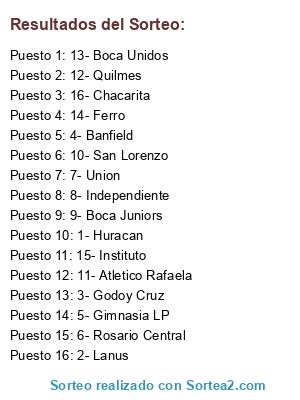 Lista de participantes: 1- Huracan, 2- Lanus, 3- Godoy Cruz, 4- Banfield, 5- Gimnasia LP, 6- Rosario Central, 7- Union, 8- Independiente, 9- Boca Juniors, 10- San Lorenzo, 11- Atletico Rafaela, 12- Quilmes, 13- Boca Unidos, 14- Ferro, 15- Instituto, 16- Chacarita.