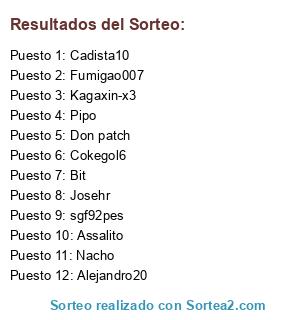Lista de participantes: Don patch, Nacho, Alejandro20, Assalito, Kagaxin-x3, Josehr, Cadista10, Pipo, Bit, Cokegol6, Fumigao007, sgf92pes.