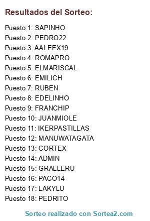 Lista de participantes: PACO14, AALEEX19, EMILICH, ROMAPRO, JUANMIOLE, MANUWATAGATA, LAKYLU, ADMIN, EDELINHO, CORTEX, FRANCHIP, PEDRITO, GRALLERU, RUBEN, IKERPASTILLAS, SAPINHO, ELMARISCAL, PEDRO22.