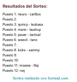 Lista de participantes: neuro - carlitos, pauer - tactical, quincy - tsubasa, weevil - tano, kicks - sammy, marsi - laudrup, moosie - filip, roq, , , , .