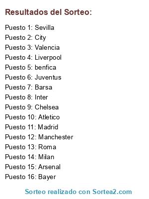 Lista de participantes: Juventus , benfica , Roma, Atletico , Arsenal , Manchester, Chelsea , Liverpool , City , Barsa , Madrid, Sevilla, Valencia, Milan, Inter, Bayer.