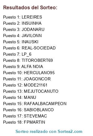 Lista de participantes: FPMARTIN, LEREIRES, REAL-SOCIEDAD, RAFAALBACAMPEON, JOAGONCOR, ALFA NOIA, STEVEMAC, HERCULANO95, LP_6, TITOROBERT69, MANU, INAUSKI, JAVILONN, JODANARU, MODE21161, INSUINHA, MEJUTOCANUTO, SABIOBLANCO.