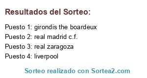 Lista de participantes: bayern, LA, liverpool, real madrid, girondins, zaragoza.