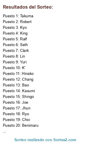 Lista de participantes: K', Maxima, Ramon, Vanessa, Benimaru, Shingo, Lin, Seth, Terry, Andy, Joe, Blue Mary, Ryo, Robert, King, Takuma, Leona, Ralf, Clark, Whip, Athena, kensou, Chin, Bao, Mai, Yuri, Kasumi, Hinako, Kim, Chang, Choi, Jhun, Kyo, Iori.