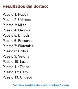 Lista de participantes: Napoli, Génova, Torino, Empoli, Udinese, Lazio, Fiorentina, Friosone, Milán, Verona, Carpi, Chueco, Bollnia.