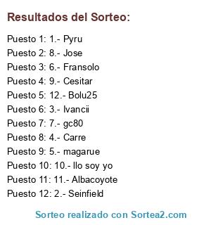 Lista de participantes: 1.- Pyru, 2.- Seinfield, 3.- Ivancii, 4.- Carre, 5.- magarue, 6.- Fransolo, 7.- gc80, 8.- Jose, 9.- Cesitar, 10.- llo soy yo, 11.- Albacoyote, 12.- Bolu25.
