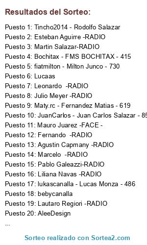 Lista de participantes: Ariel Franco. -radio -(5 participaciones), Carla Rivera DNI 810 -face-, Juan Manuel Lares DNI 223 -face-, Leonardo La Sala DNI 812 -twitter-, Cristina Sartori-twitter-, Razzonia, K9chin, Donsebametal, Lucaas, leo99 - leonardo la sala - 812, Leonardo - DNI 057, Tincho2014 - Martin Salazar - 853, Bochitax - DNI 415, lea_canalla - Leandro Giral - 474, maxi.rcentral - Maximiliano Busciglio - 170, demian - Damian Ponce - 580, elcapcanalla, neecrox - Adrian Romero - 065, DamianR, niqomdq - Nicolas Barisich - 277, DamiKanalla - Damian Martinez - 909, AleLakd - Alejandro Asad - 405, lukizzz - Lucas Guardalá - 922, Nano - Mariano Tecce - 471, pini_lak-dmia - Juan Manuel Lares - 223, br1_canalla - Bruno Baistroqui - 441.