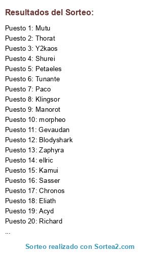 Lista de participantes: Tunante(4 participaciones), Petaeles(8 participaciones), Shurei(16 participaciones), Eliath(5 participaciones), Chronos(5 participaciones), ellric(9 participaciones), Paco(21 participaciones), Manorot(21 participaciones), Gevaudan(8 participaciones), Blodyshark(7 participaciones), Mutu(21 participaciones), Hertzo(3 participaciones), Klingsor(38 participaciones), Thorat(21 participaciones), Kamui(7 participaciones), Y2kaos(21 participaciones), Thunderspeed(6 participaciones), Richard(5 participaciones), Zaphyra(7 participaciones), morpheo(8 participaciones), Acyd(5 participaciones), Flo(8 participaciones), Sasser(6 participaciones).