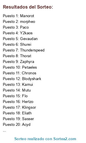 Lista de participantes: Tunante(4 participaciones), Petaeles(8 participaciones), Shurei(16 participaciones), Eliath(5 participaciones), Chronos(5 participaciones), ellric(9 participaciones), Paco(21 participaciones), Manorot(21 participaciones), Gevaudan(8 participaciones), Blodyshark(7 participaciones), Mutu(21 participaciones), Hertzo(3 participaciones), Klingsor(8 participaciones), Thorat(21 participaciones), Kamui(7 participaciones), Y2kaos(21 participaciones), Thunderspeed(6 participaciones), Richard(5 participaciones), Zaphyra(7 participaciones), morpheo(8 participaciones), Acyd(5 participaciones), Flo(8 participaciones), Sasser(6 participaciones).