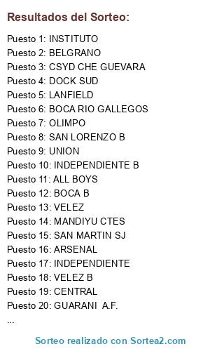 Lista de participantes: ALDOSIVI, ARGENTINOS, ARSENAL, GODOY CRUZ, HURACAN, INDEPENDIENTE, INSTITUTO, PATRONATO, RIVER, SARMIENTO, TIGRE, VELEZ, ALL BOYS, ALMIRANTE BROWN, ATLETICO TUCUMAN, BELGRANO, BOCA UNIDOS, CAI, CHACARITA, COLON, DEFENSA Y JUSTICIA, DEP. MERLO, DOCK SUD, INDEPENDIENTE RIV., ITUZAINGO, LANUS, NEWELLS, CENTRAL, SAN MARTIN SJ, TALLERES, TIRO FEDERAL, UNION, ATLETICO RAFAELA, BOCA B, BOCA RIO GALLEGOS, LANFIELD, HURACAN B, INDEPENDIENTE B, MANDIYU CTES, OLIMPO, QUILMES, SAN LORENZO B, SAN MARTIN TUCUMAN, VELEZ B, ESTRELLA ROJA, CSYD CHE GUEVARA, SARMIENTO DE RESISTENCIA, GUARANI A.F..