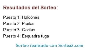 Lista de participantes: Pipitas, Halcones, Gorilas, Esquadra tuga.