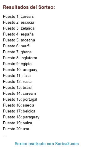 Lista de participantes: españa, alemania, argetina, mexico, brasil, chile, corea n, corea s, marfil, dinamarca, suecia, usa, francia, ghana, grecia, inglaterra, italia, japon, nigeria, zelanda, holanda, paraguay, portugal, suiza, uruguay, egipto, escocia, rusia, cracia, belgica.