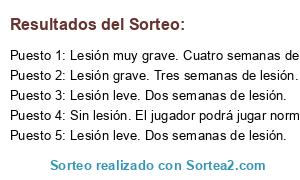 Lista de participantes: Sin lesión. El jugador podrá jugar normalmente la siguiente semana. (4 participaciones), Tocado. El jugador se perderá todos los partidos de la siguiente semana. (7 participaciones), Lesión leve. Dos semanas de lesión. (4 participaciones), Lesión grave. Tres semanas de lesión. (3 participaciones), Lesión muy grave. Cuatro semanas de lesión..