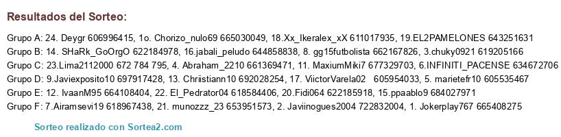 Lista de participantes: 1. Jokerplay767 665408275, 2. Javiinogues2004 722832004, 3.chuky0921 619205166, 4. Abraham_2210 661369471, 5. marietefr10 605535467, 6.INFINITI_PACENSE 634672706, 7.Airamsevi19 618967438, 8. gg15futbolista 662167826, 9.Javiexposito10 697917428, 1o. Chorizo_nulo69 665030049, 11. MaxiumMiki7 677329703, 12. IvaanM95 664108404, 13. Chriistiann10 692028254, 14. SHaRk_GoOrgO 622184978, 15.ppaablo9 684027971, 16.jabali_peludo 644858838, 17. ViictorVarela02 605954033, 18.Xx_Ikeralex_xX 611017935, 19.EL2PAMELONES 643251631, 20.Fidi064 622185918, 21. munozzz_23 653951573, 22. El_Pedrator04 618584406, 23.Lima2112000 672 784 795, 24. Deygr 606996415.