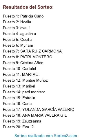 Lista de participantes: Montse Muñoz, Cartafol, Cecilia, Patricia Cano, Zsuzsanna, eva 1, patri montero, Estrella, Cristina Añon, Carla, Myriam, Eva 2, agustin a, Maribel, MARTA a., Noelia, SARA RUIZ CARMONA, YOLANDA GARCÍA VALERIO, ANA MARIA VALERA GIL, PATRI MONTERO.
