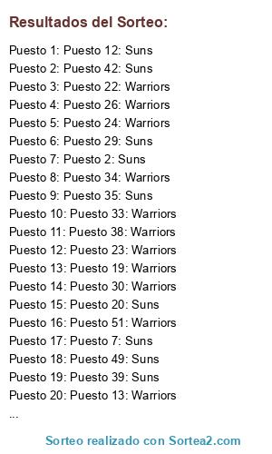 Lista de participantes: Puesto 1: Warriors, Puesto 2: Suns, Puesto 3: Suns, Puesto 4: Warriors, Puesto 5: Suns, Puesto 6: Warriors, Puesto 7: Suns, Puesto 8: Warriors, Puesto 9: Warriors, Puesto 10: Suns, Puesto 11: Warriors, Puesto 12: Suns, Puesto 13: Warriors, Puesto 14: Suns, Puesto 15: Warriors, Puesto 16: Suns, Puesto 17: Suns, Puesto 18: Suns, Puesto 19: Warriors, Puesto 20: Suns, Puesto 21: Suns, Puesto 22: Warriors, Puesto 23: Warriors, Puesto 24: Warriors, Puesto 25: Warriors, Puesto 26: Warriors, Puesto 27: Warriors, Puesto 28: Suns, Puesto 29: Suns, Puesto 30: Warriors, Puesto 31: Suns, Puesto 32: Suns, Puesto 33: Warriors, Puesto 34: Warriors, Puesto 35: Suns, Puesto 36: Warriors, Puesto 37: Warriors, Puesto 38: Warriors, Puesto 39: Suns, Puesto 40: Suns, Puesto 41: Suns, Puesto 42: Suns, Puesto 43: Warriors, Puesto 44: Suns, Puesto 45: Suns, Puesto 46: Warriors, Puesto 47: Warriors, Puesto 48: Suns, Puesto 49: Suns, Puesto 50: Warriors, Puesto 51: Warriors, Puesto 52: Suns, Puesto 53: Suns, Puesto 54: Warriors, Puesto 55: Suns, Puesto 56: Warriors, Puesto 57: Warriors.