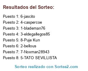 Lista de participantes: 1-blademan76, 2-bellous, 3-eldegallegos85, 4-caspercoe, 5-TATO SEVILLISTA, 6-jascito, 7-Noxman28943, 8-Puje Kun.