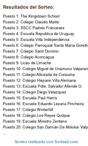 Lista de participantes: Escuela Paul Harris, Escuela Pdte. Salvador Allende G., Escuela Villa Independencia, Escuela Ministro Zenteno, Escuela Eduardo Lezana Pincheira, The Kingstown School, Liceo Parroquial San Antonio, Colegio Claudio Matte, Colegio Diego Velazquez, Colegio Saint Dominic, SSCC Padres Franceses, Escuela Oro Negro Con Con, Colegio Parroquial Santa Maria Goretti, Escuela Republica de Uruguay, Colegio Miguel de Unamuno Valparaiso, Colegio Alborada de Curauma, Colegio San Damián De Molokai Valparaíso, Colegio Los Reyes Quilpue, Colegio Aconcagua, Colegio Hispano Villa Alemana, Liceo de Limache, Colegio Winterhill.